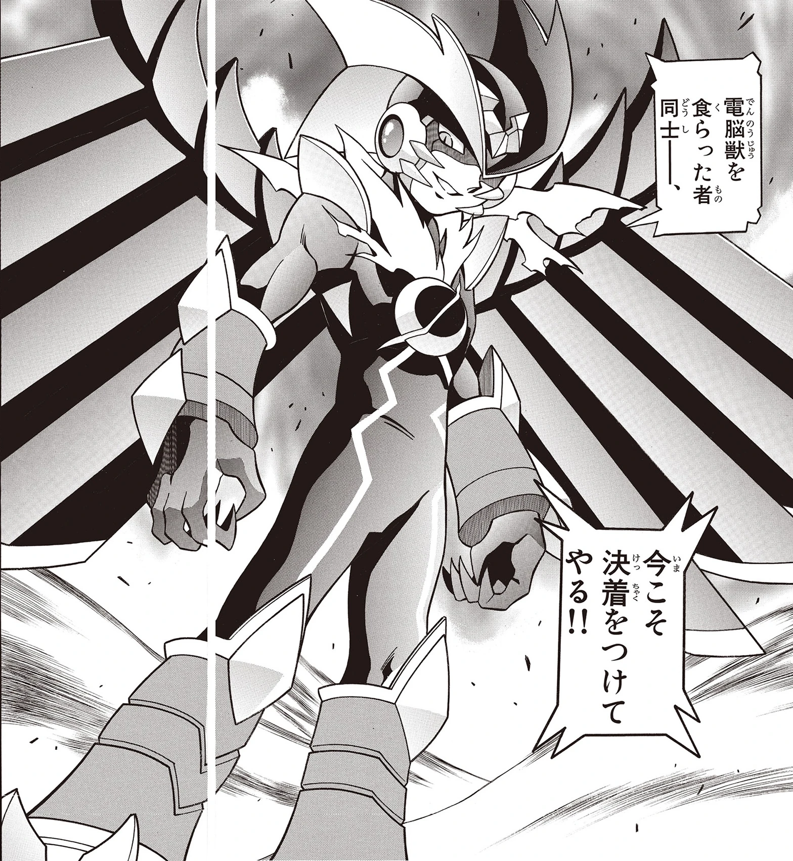 This didn't last long once the Cyber Beast started to absorb the real world into the Cyber World, with only MegaMan, Lan, and himself remaining. Bass confronts MegaMan, telling him to give up since it was already too late. Satisfied that he could watch the end of mankind, he challenges MegaMan to finish their battle. Disappointed with Bass' answer, MegaMan goes to confront the Cyber Beast, having yet to give up hope. Bass wonders if this is really the ending he had been hoping for.